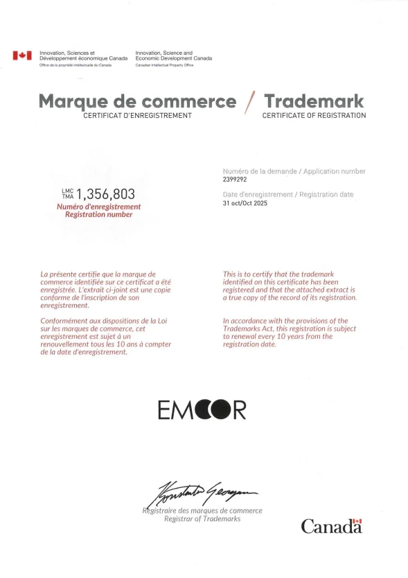 We are pleased to announce that the trademark “EMOOR”, for which our company applied, has been officially registered by the Canadian Intellectual Property Office (CIPO).