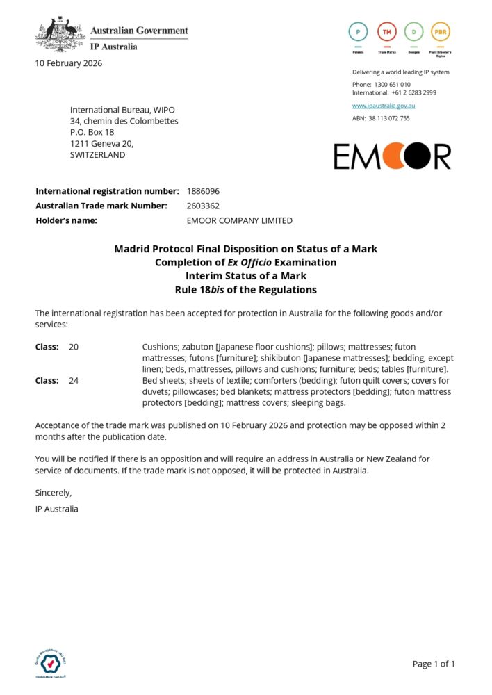 We are pleased to announce that the trademark “EMOOR”, for which our company applied, has been officially registered by IP Australia.