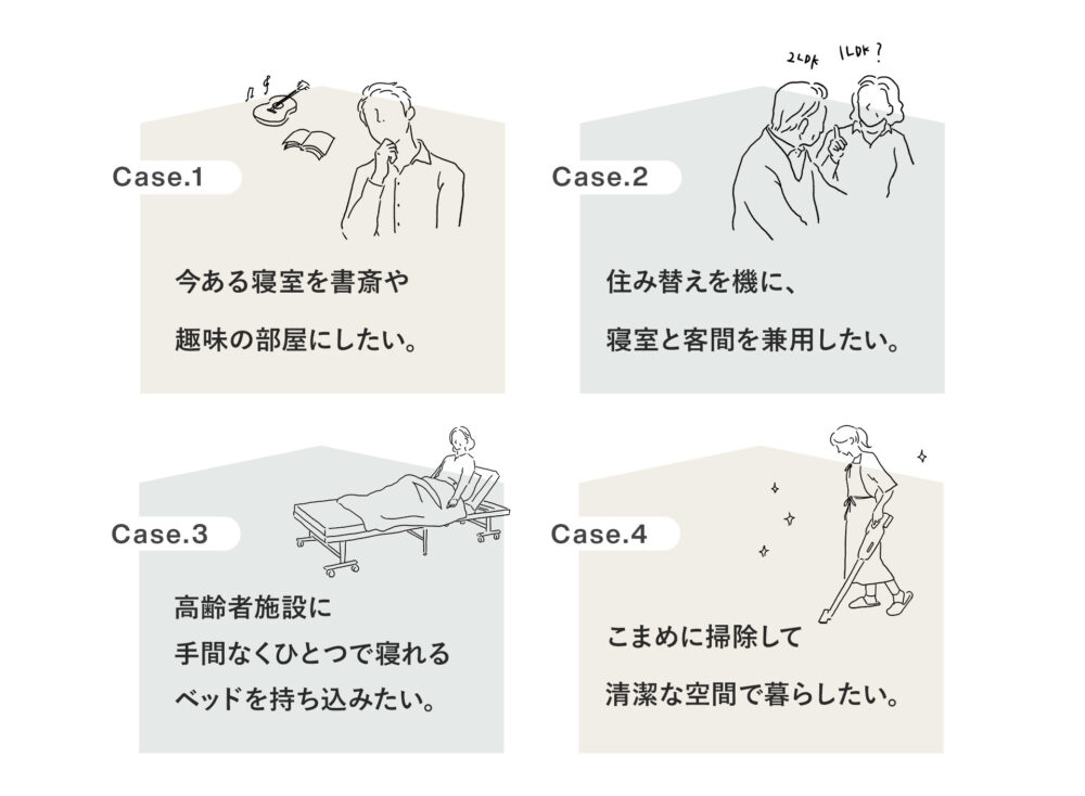 - 70~90代:高齢者施設への入居時に、ストレスなく快適に眠り、休む場所を運び入れることができます。