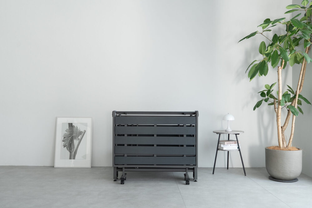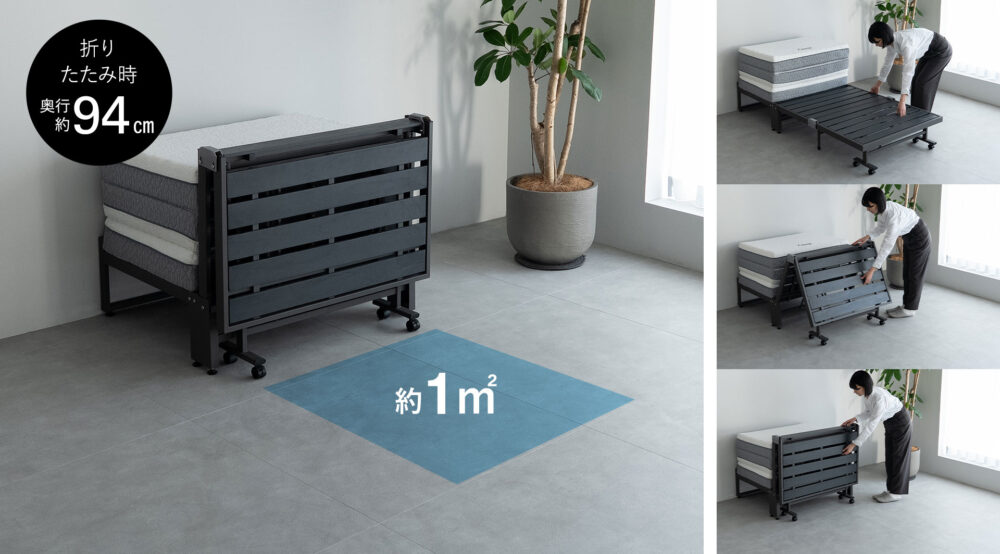 ファーブルは、折りたたむことで一般的なシングルベッドの半分以下のサイズ(奥行約94cm)に変形します。ベッドルームに生まれた約1平方メートル(約100×100cm)は、限られた室内の導線をすっきりさせるだけでなく、趣味や運動など、ベッドルームの新たな使い方を提案します。